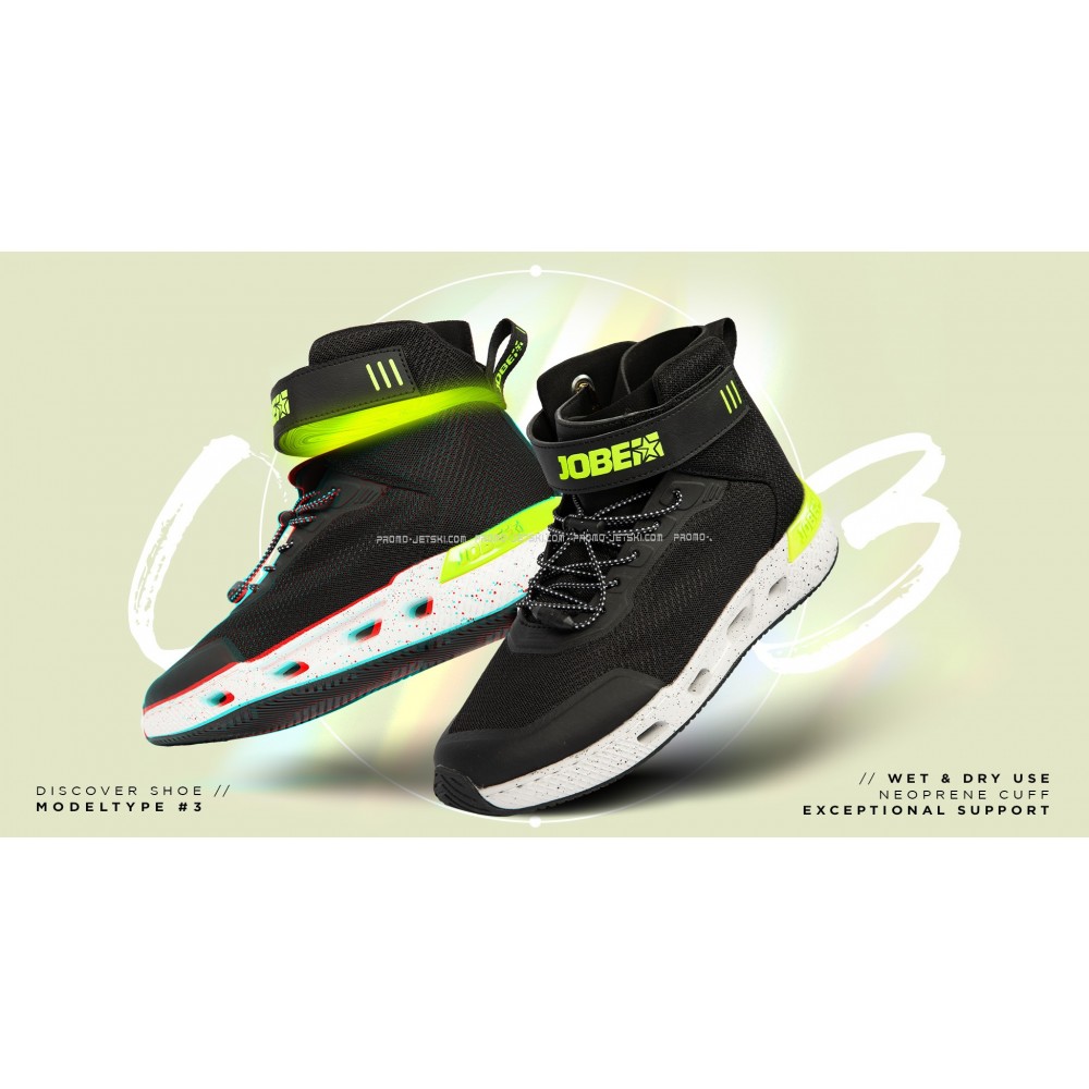 The Jobe Discover Watersports Sneaker High Black can handle it all while looking great! We redesigned this shoe to be able to handle everything from a long SUP trip to a quick dip in the water. This sneaker was designed and tested with a unique sole for optimal water drainage and excellent grip. It features a quick-drying upper and a comfortable Velcro strap and lace system for a secure fit. Your feet stay in place, even when you're pushing your limits! A sneaker that looks good on land and water and is meant to be taken everywhere.