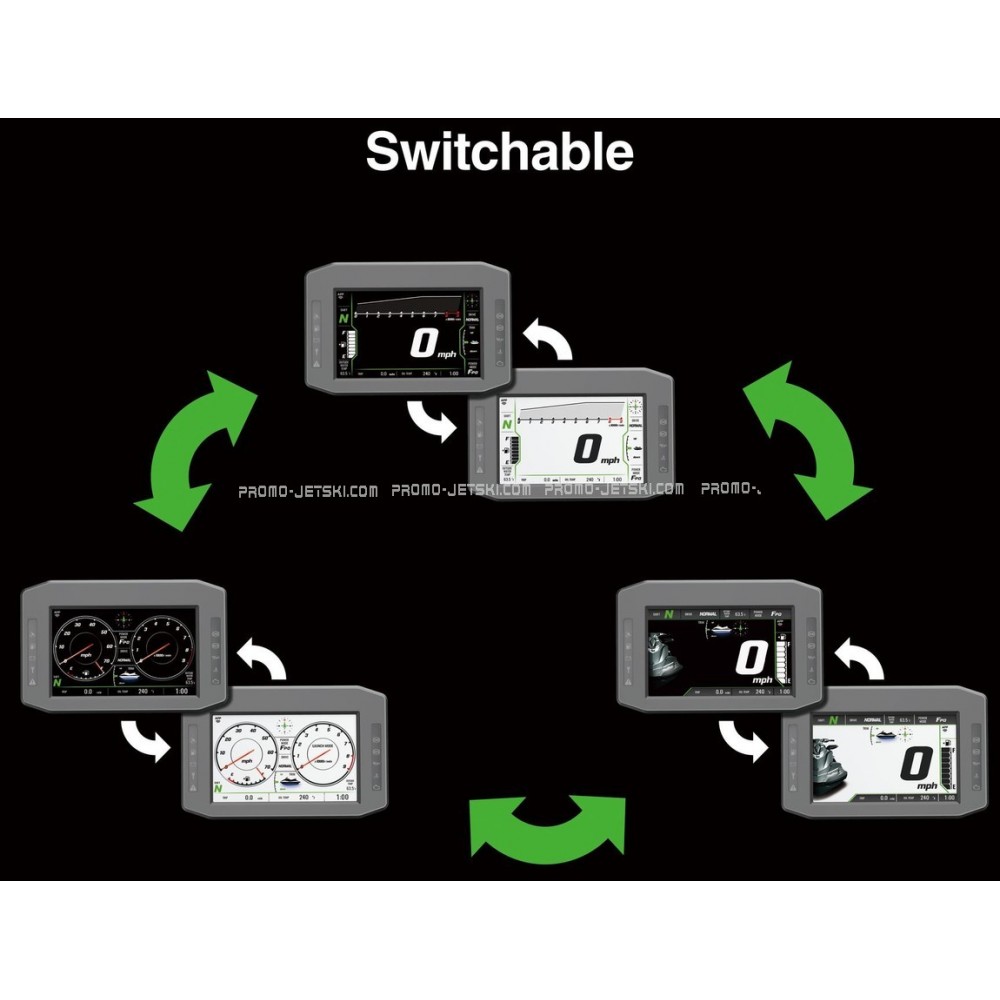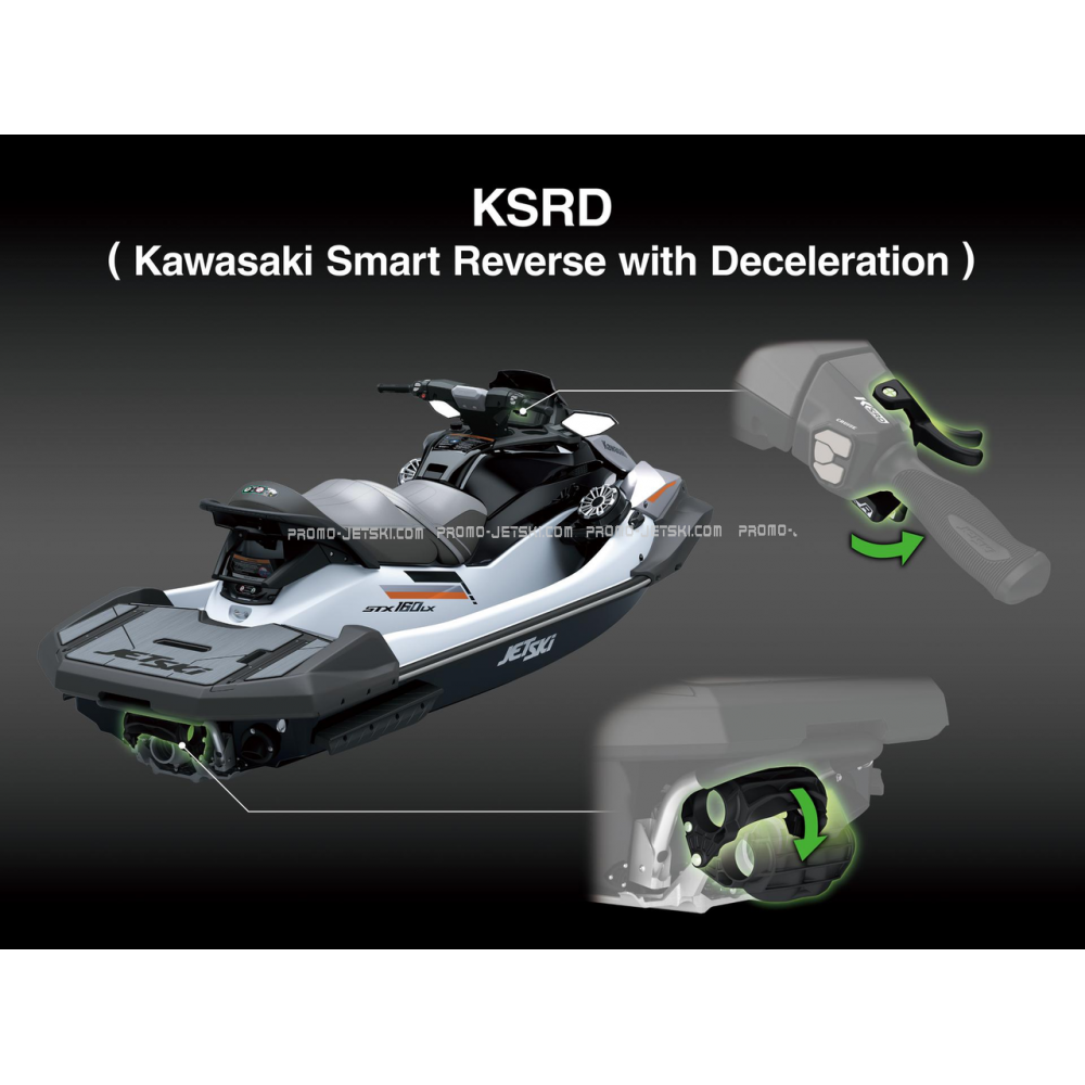 The Kawasaki Smart Reverse with Deceleration (KSRD) system electrically activates reverse gear. Controlled by a thumb switch on the right handlebar, it allows for one-handed thrust control and helps slow the Jet Ski down.