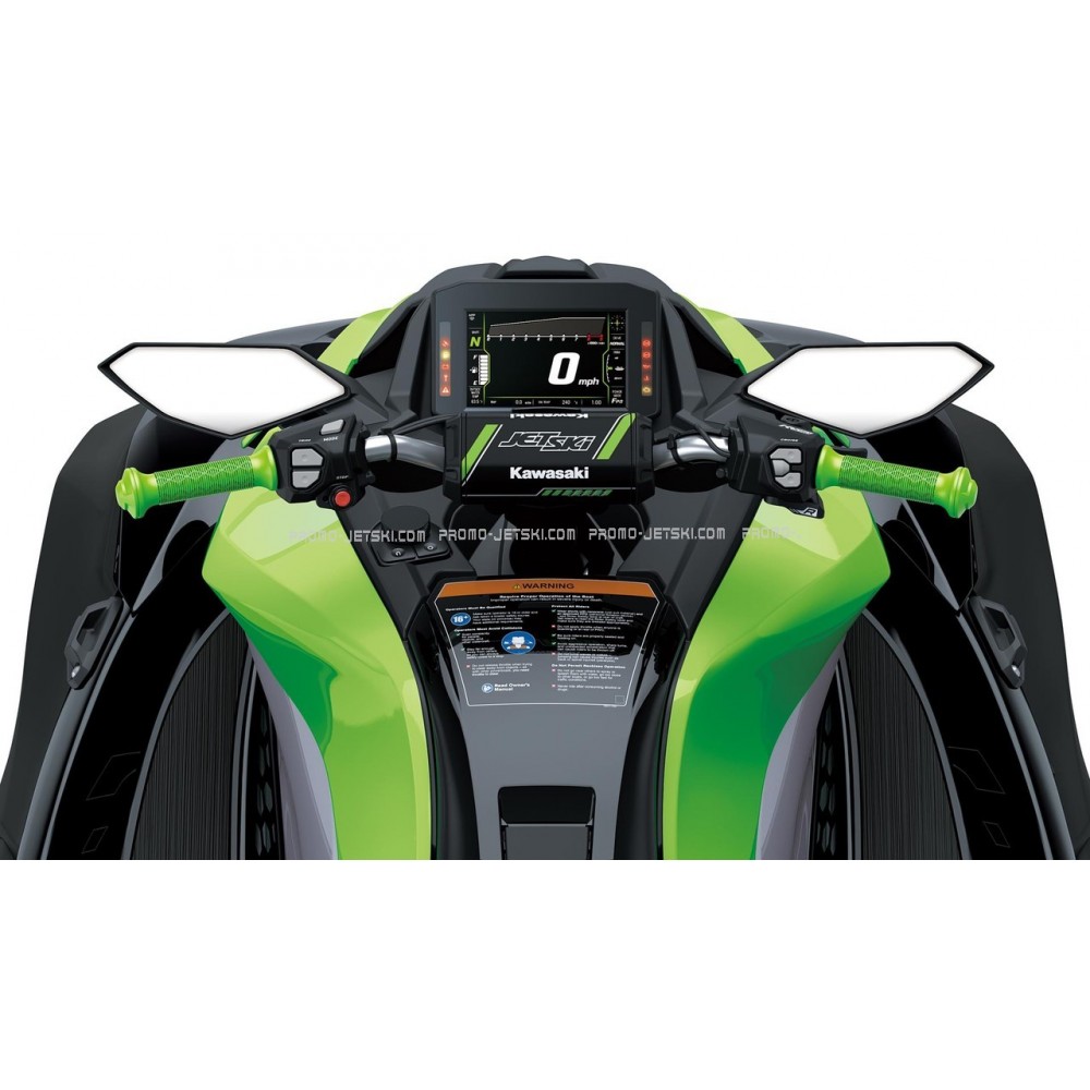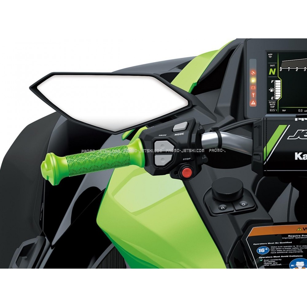 The Kawasaki Smart Reverse with Deceleration (KSRD) system electrically activates reverse gear. Controlled by a thumb switch on the right handlebar, it allows for one-handed thrust control and helps slow the Jet Ski down.