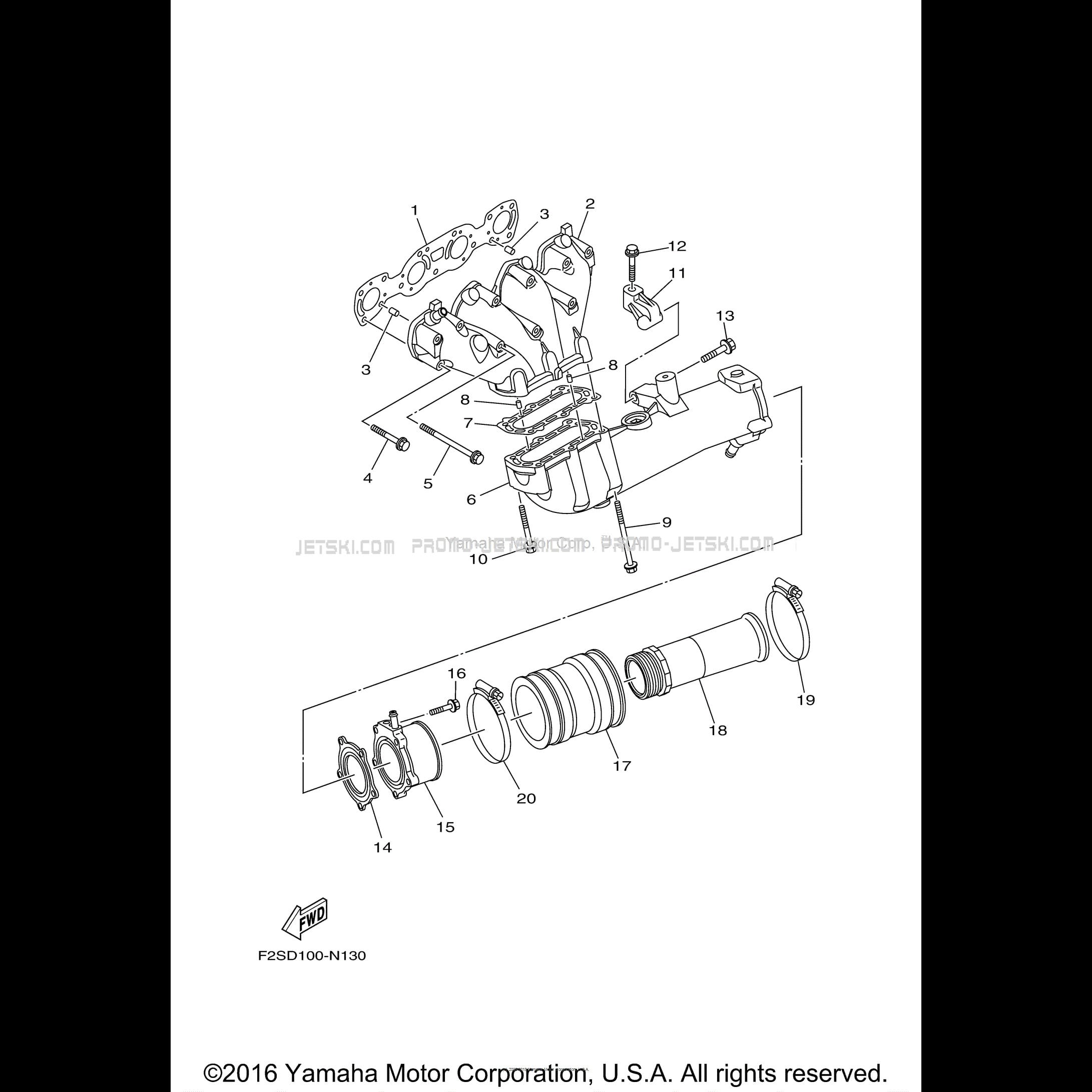 Below, find all references of original and spare parts for EXHAUST 1 for your Yamaha WAVE RUNNER FX SHO - FA1800P - 2015 2015 WaveRunner and available at Promo-jetski.com.