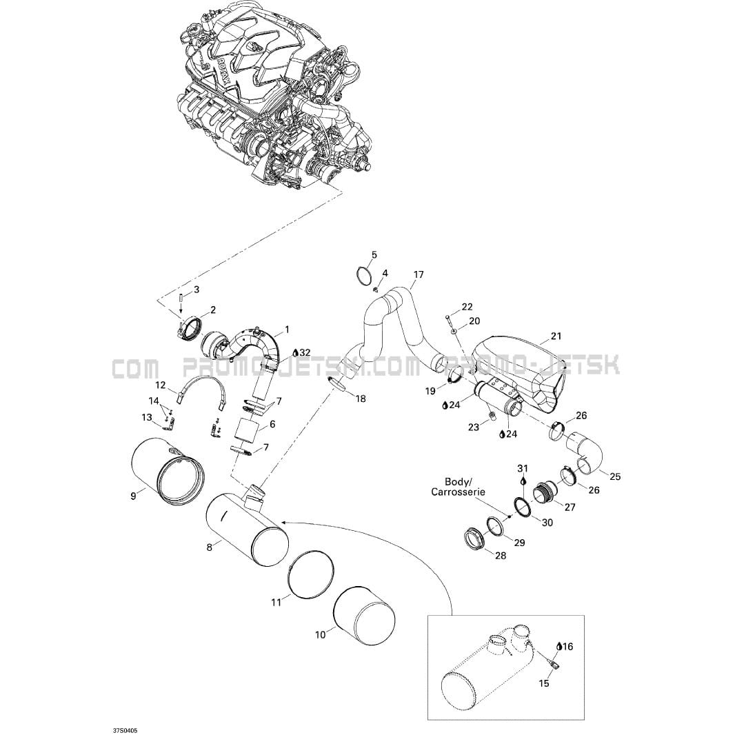 Below, find all references of original and spare parts for 01- Exhaust System for your Sea-Doo GTX 4-TEC, 2004 2004 and available at Promo-jetski.com.