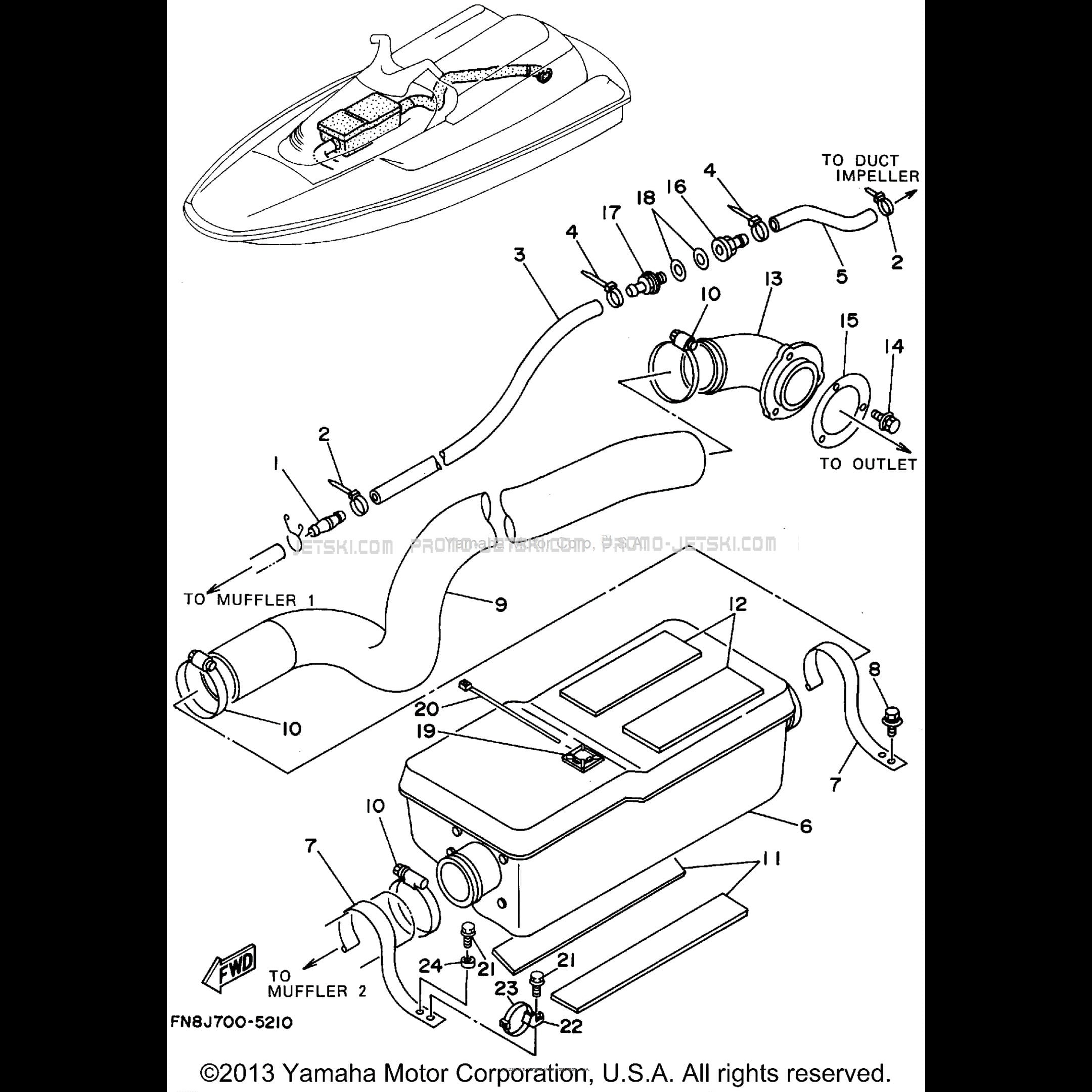 Below, find all references of original and spare parts for EXHAUST 2 for your Yamaha WAVE RUNNER VXR - WRB650T - 1995 1995 WaveRunner and available at Promo-jetski.com.