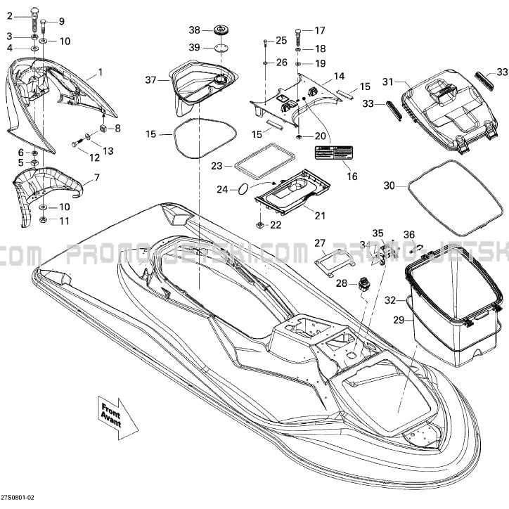 Below, find all references of original and spare parts for 09- Body, Front View for your Sea-Doo GTX 215, 2008 2008 and available at Promo-jetski.com.