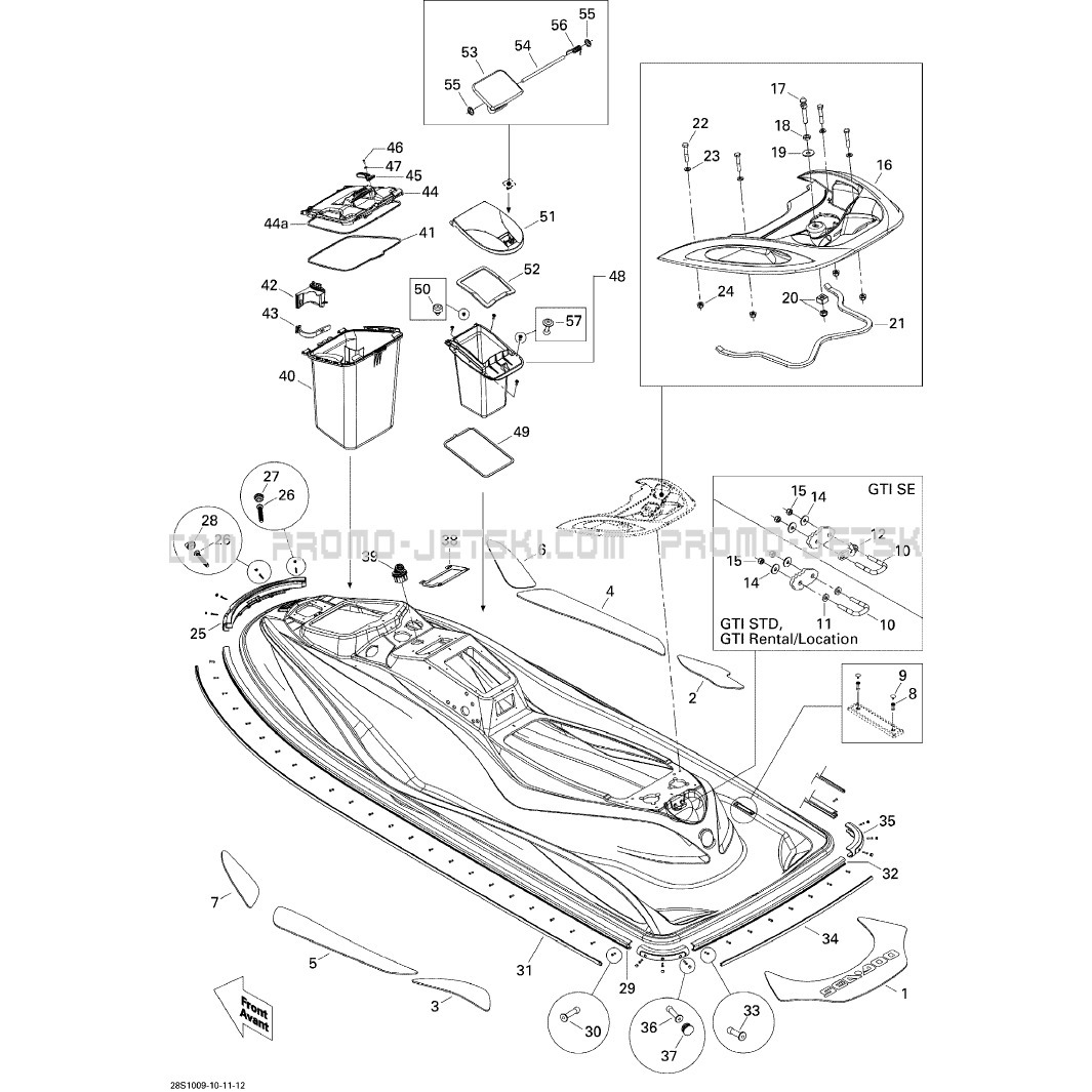 Below, find all references of original and spare parts for 09- Body, Rear View for your Sea-Doo GTI SE 155, 2010 2010 and available at Promo-jetski.com.