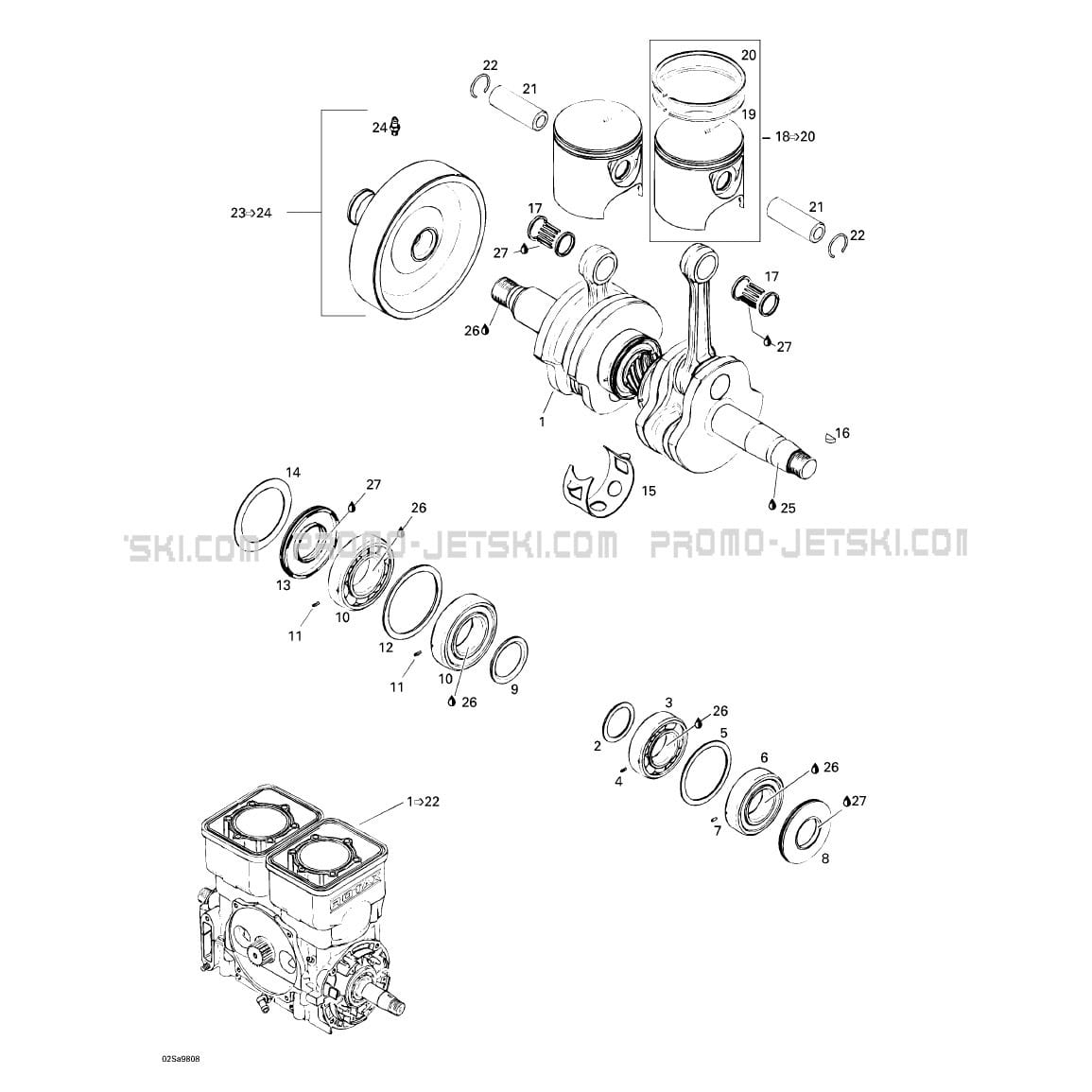 Below, find all references of original and spare parts for 01- Crankshaft And Pistons for your Sea-Doo GTS, 5819, 1998 1998 and available at Promo-jetski.com.