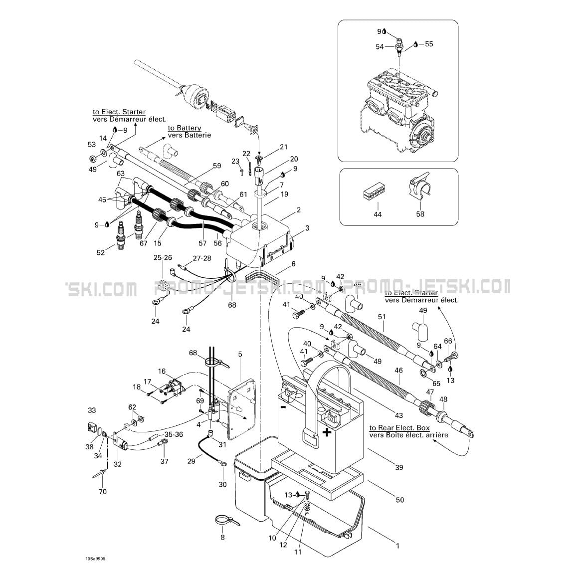 Below, find all references of original and spare parts for 10- Rear Electrical Box for your Sea-Doo GTI, 5884 5885, 1999 1999 and available at Promo-jetski.com.