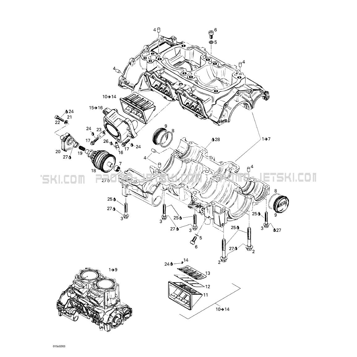Below, find all references of original and spare parts for 01- Crankcase for your Sea-Doo RX, 5579 5580 5581 5582, 2002 2002 and available at Promo-jetski.com.