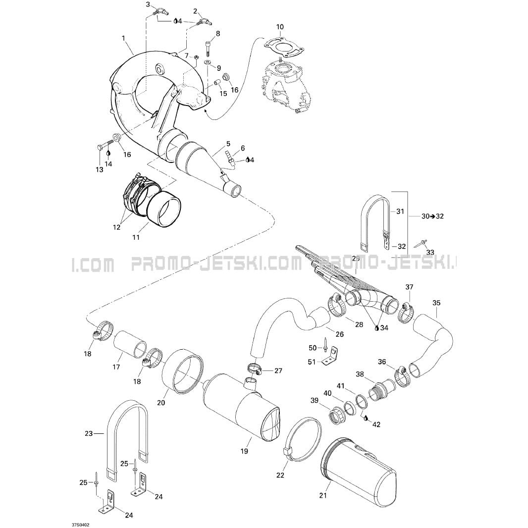 Below, find all references of original and spare parts for 01- Exhaust System for your Sea-Doo GTI LE, 2004 2004 and available at Promo-jetski.com.