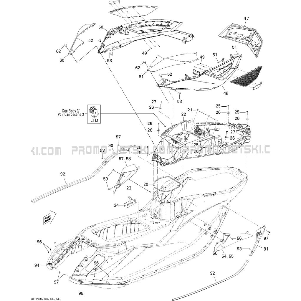 Below, find all references of original and spare parts for 09- Body, Rear View 2 for your Sea-Doo RXT iS 260, 2011 2011 and available at Promo-jetski.com.