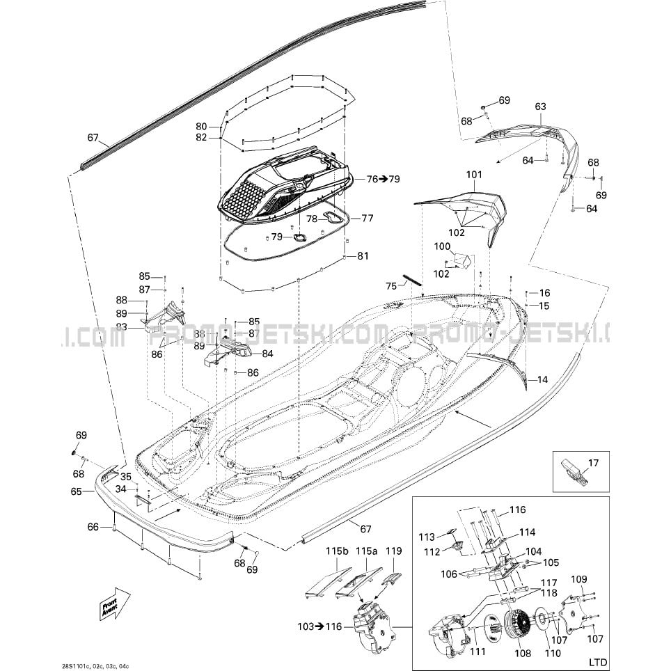 Below, find all references of original and spare parts for 09- Body, Rear View 3 for your Sea-Doo RXT iS 260, 2011 2011 and available at Promo-jetski.com.