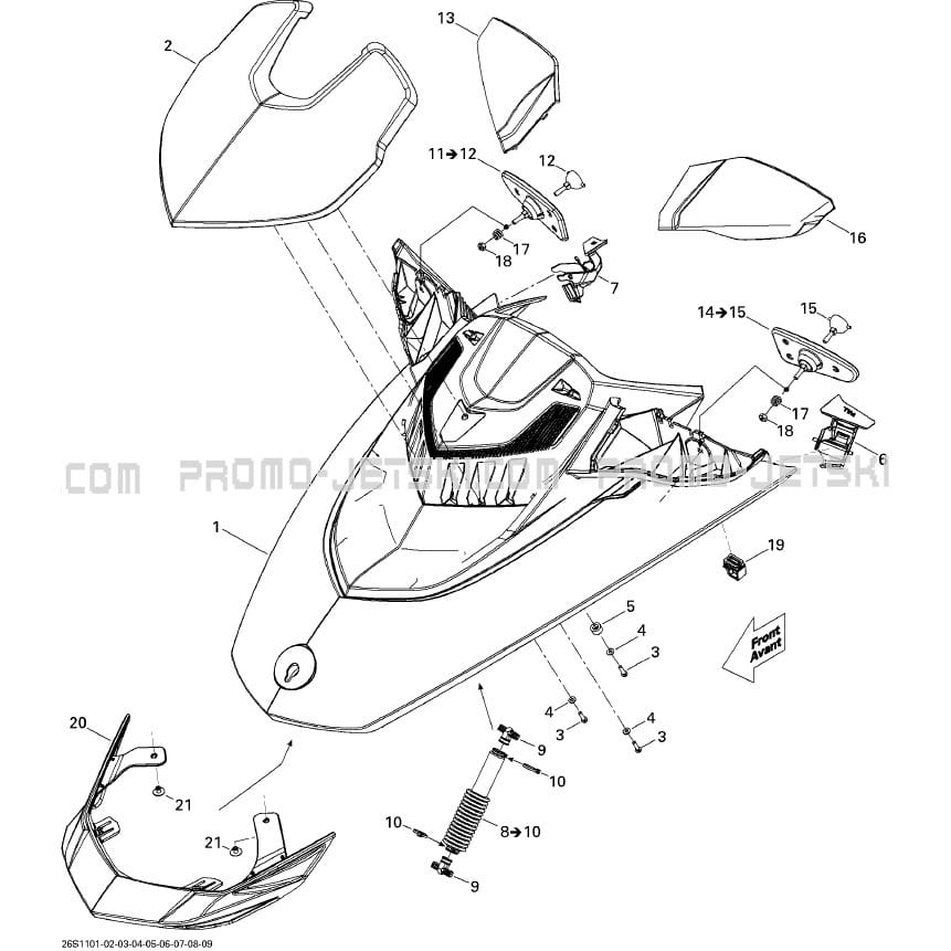 Below, find all references of original and spare parts for 09- Front Cover for your Sea-Doo RXT iS 260, 2011 2011 and available at Promo-jetski.com.