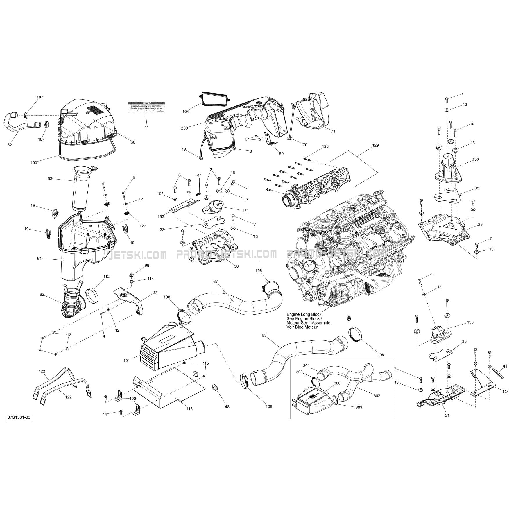 Here is the diagram showing the 01- Engine And Air Intake Silencer for Sea-Doo RXT-X aS 260 & RS. 2013.