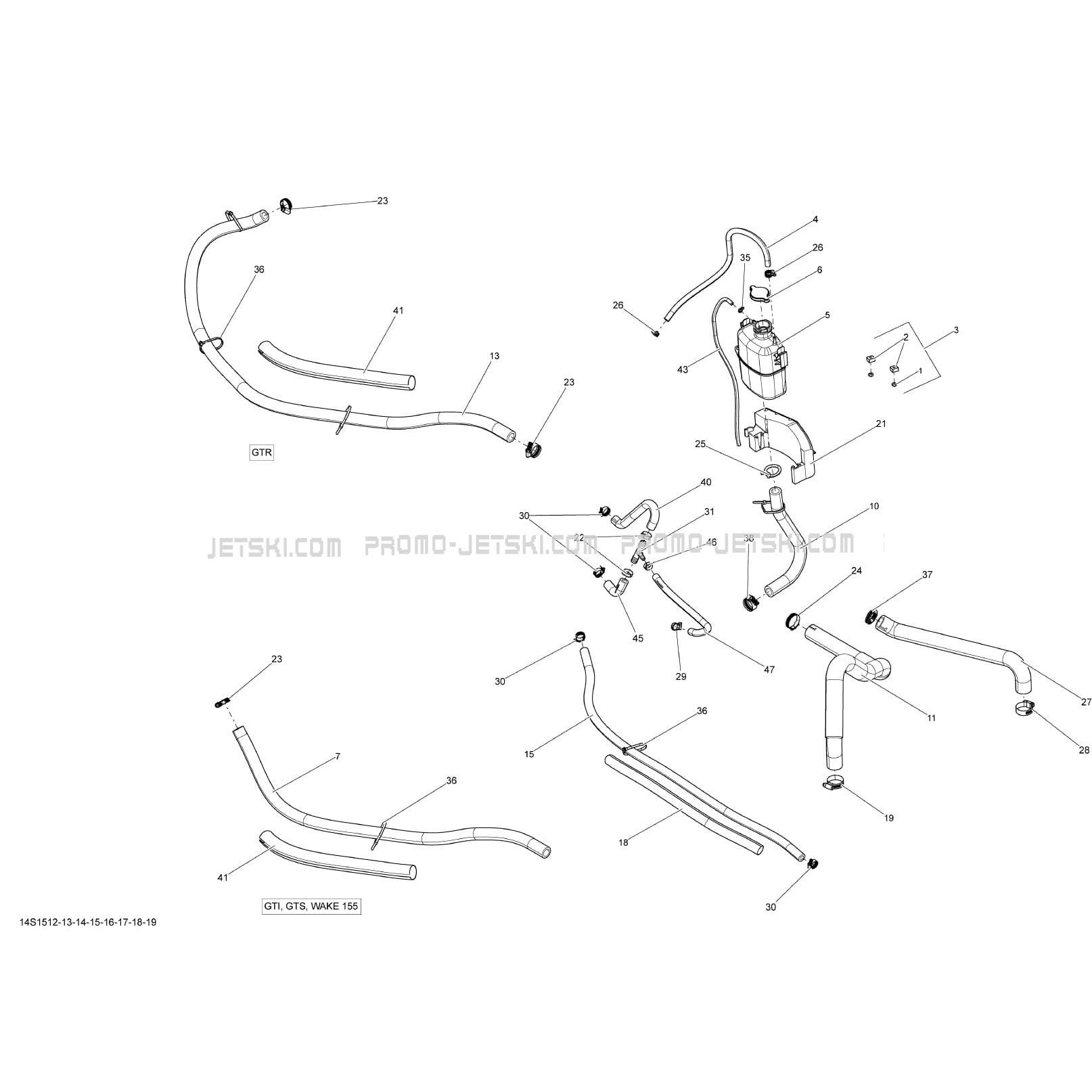 Below, find all references of original and spare parts for 01- Cooling System _14S1516 for your Sea-Doo GTI LTD 155, 2015 2015 and available at Promo-jetski.com.