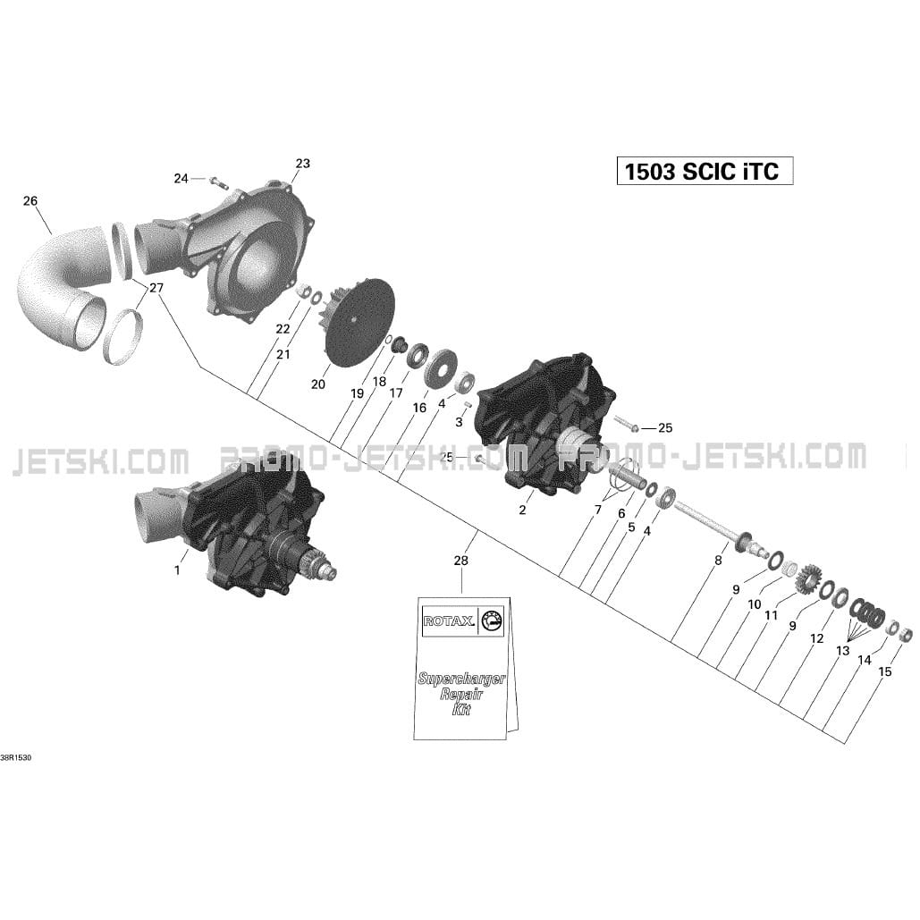 Below, find all references of original and spare parts for 02- Supercharger _38R1530 for your Sea-Doo WAKE PRO 215, 2015 2015 and available at Promo-jetski.com.