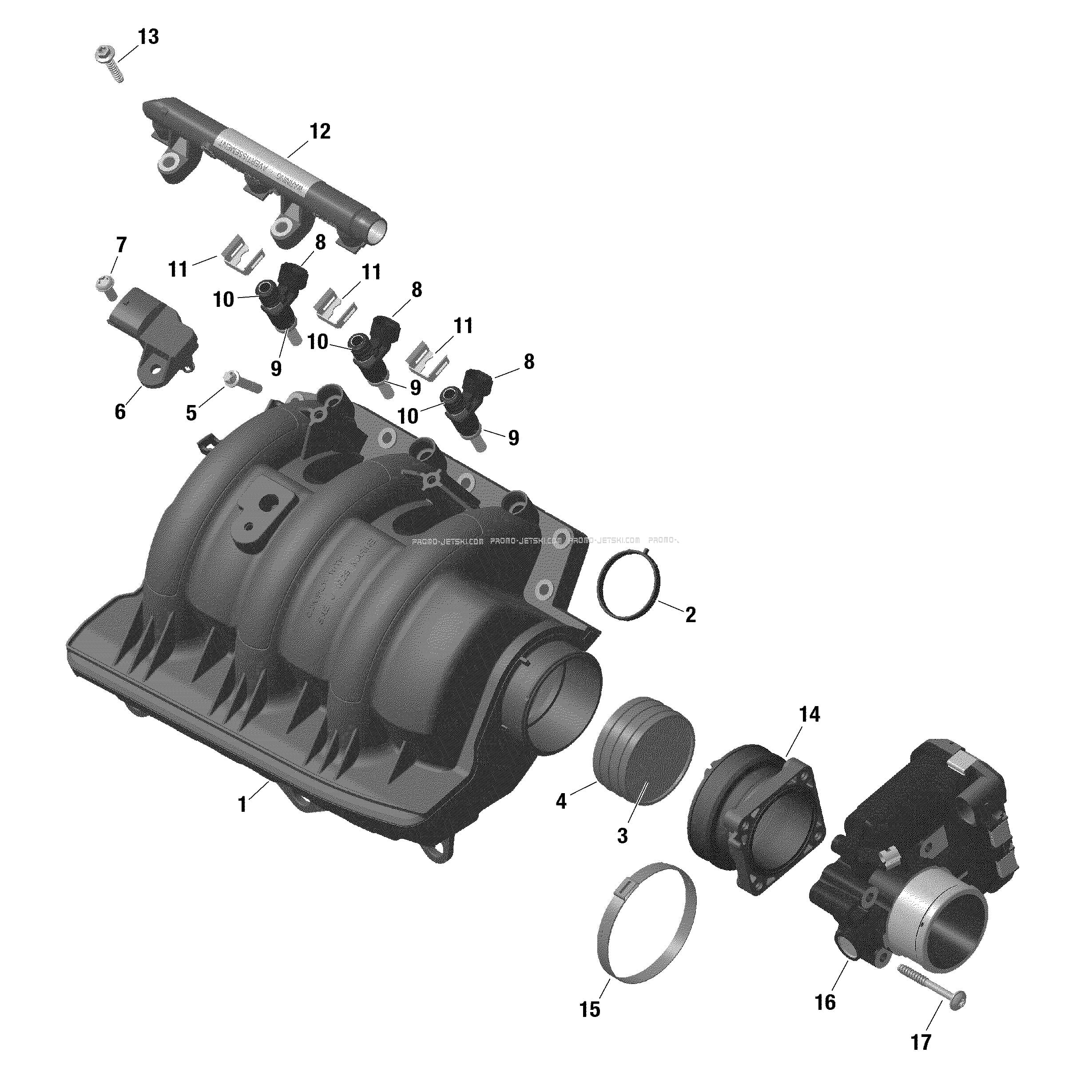 Below, find all references of original and spare parts for Rotax - Collecteur Admission Air Et Carter De Papillon Fabriqué à partir du 29 sept 2020 for your Sea-Doo GTI 90 2021 and available at Promo-jetski.com.