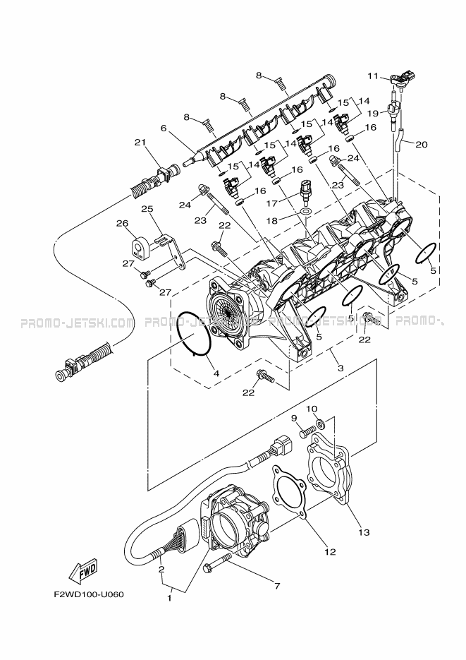 Below, find all references of original and spare parts for INTAKE 1 for your Yamaha GP1800B-W 2021 and available at Promo-jetski.com.