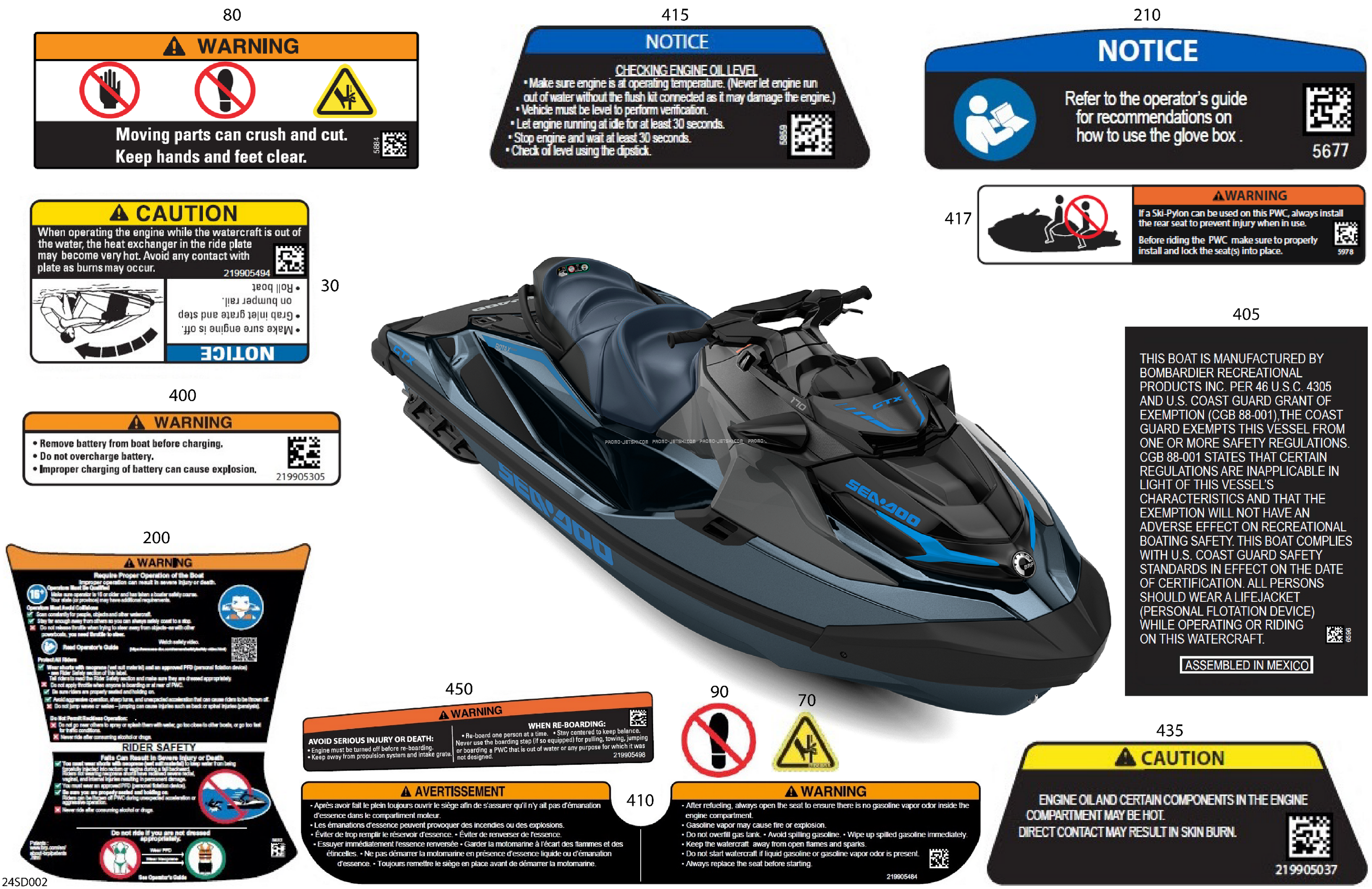 Below, find all references of original and spare parts for Body - Warning Decals for your Sea-Doo GTX 170 - 11RD - STD package - Blue Abyss - Audio 2024 and available at Promo-jetski.com.