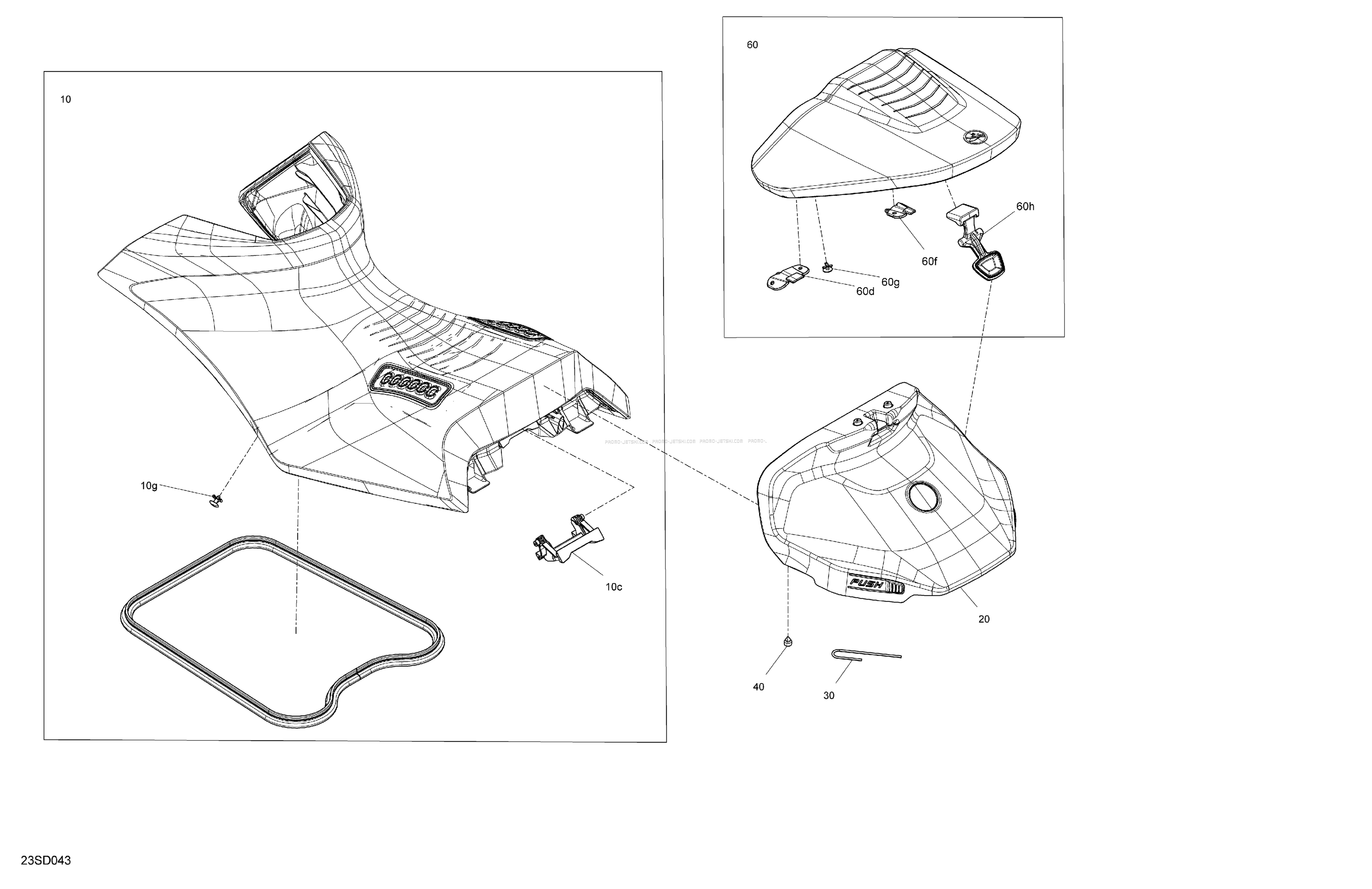 Below, find all references of original and spare parts for Body - Seat for your Sea-Doo RXP-X 325 - 21RD - X package - Fiery Red Metallic 2024 and available at Promo-jetski.com.