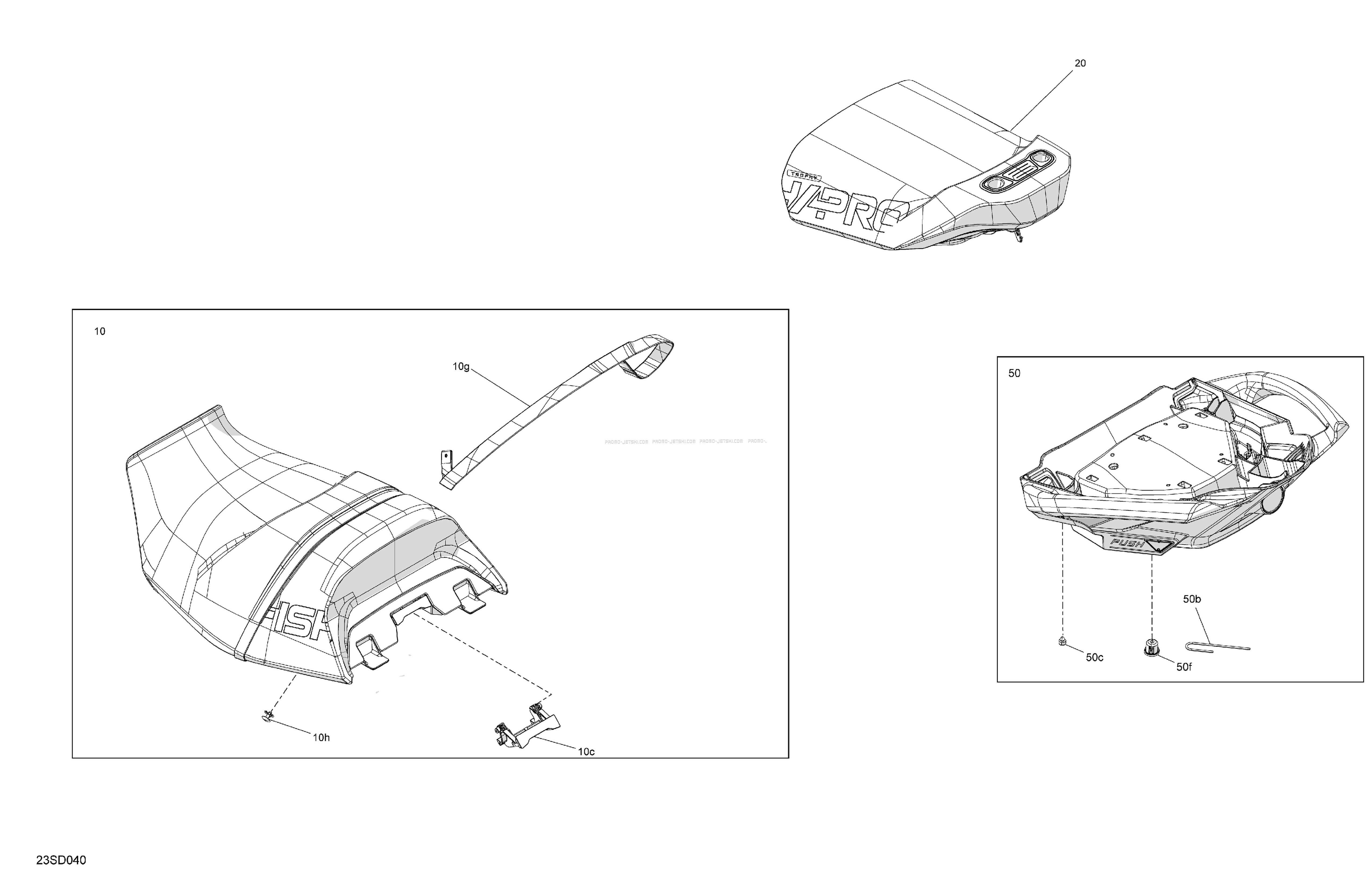 Below, find all references of original and spare parts for Body - Seat for your Sea-Doo EXPLORER 300 - 17RE - Iceland Grey - Audio 2024 and available at Promo-jetski.com.