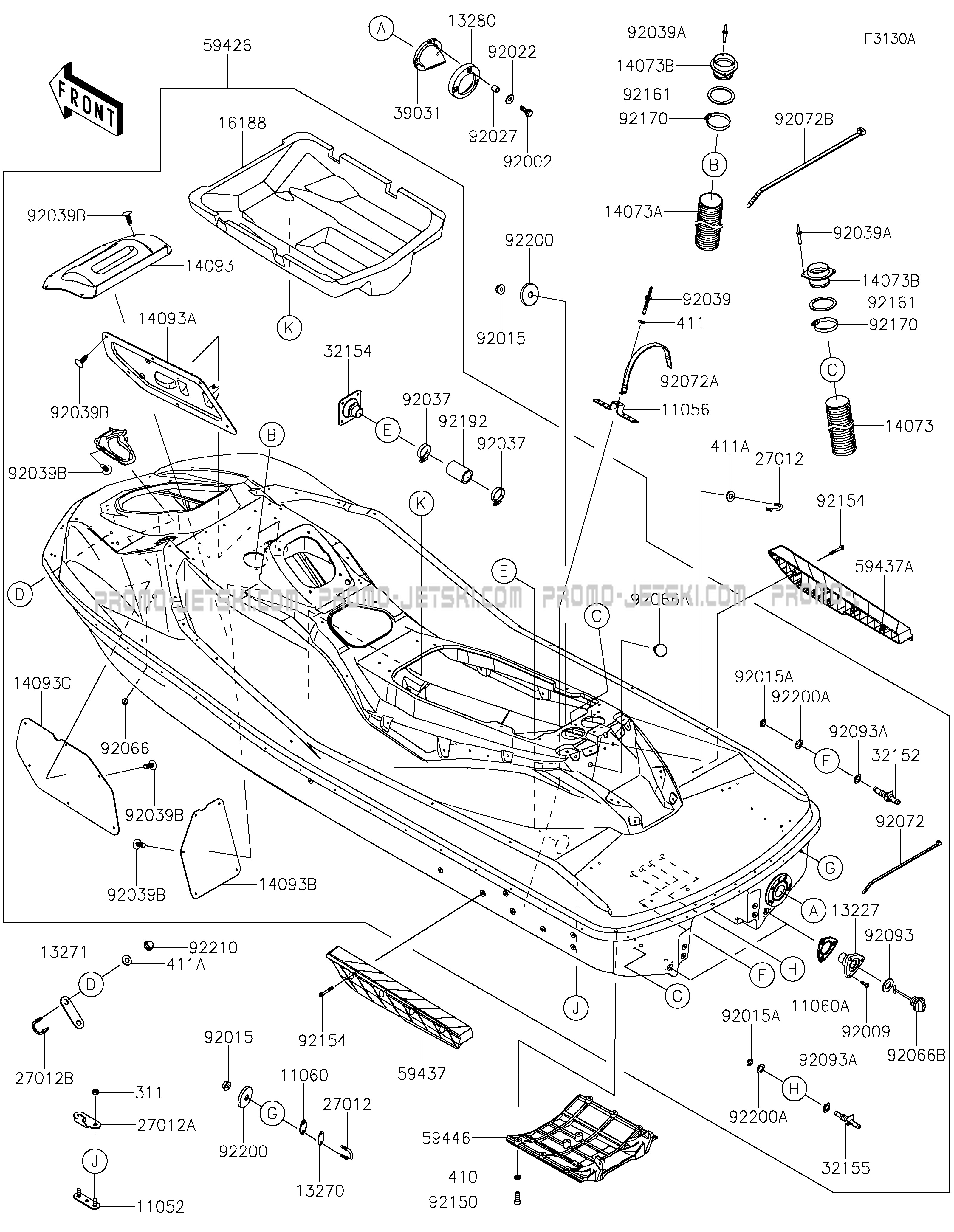 Below, find all references of original and spare parts for Hull(CSSNN) for your Kawasaki Ultra 160LX-S Angler 2025 and available at Promo-jetski.com.