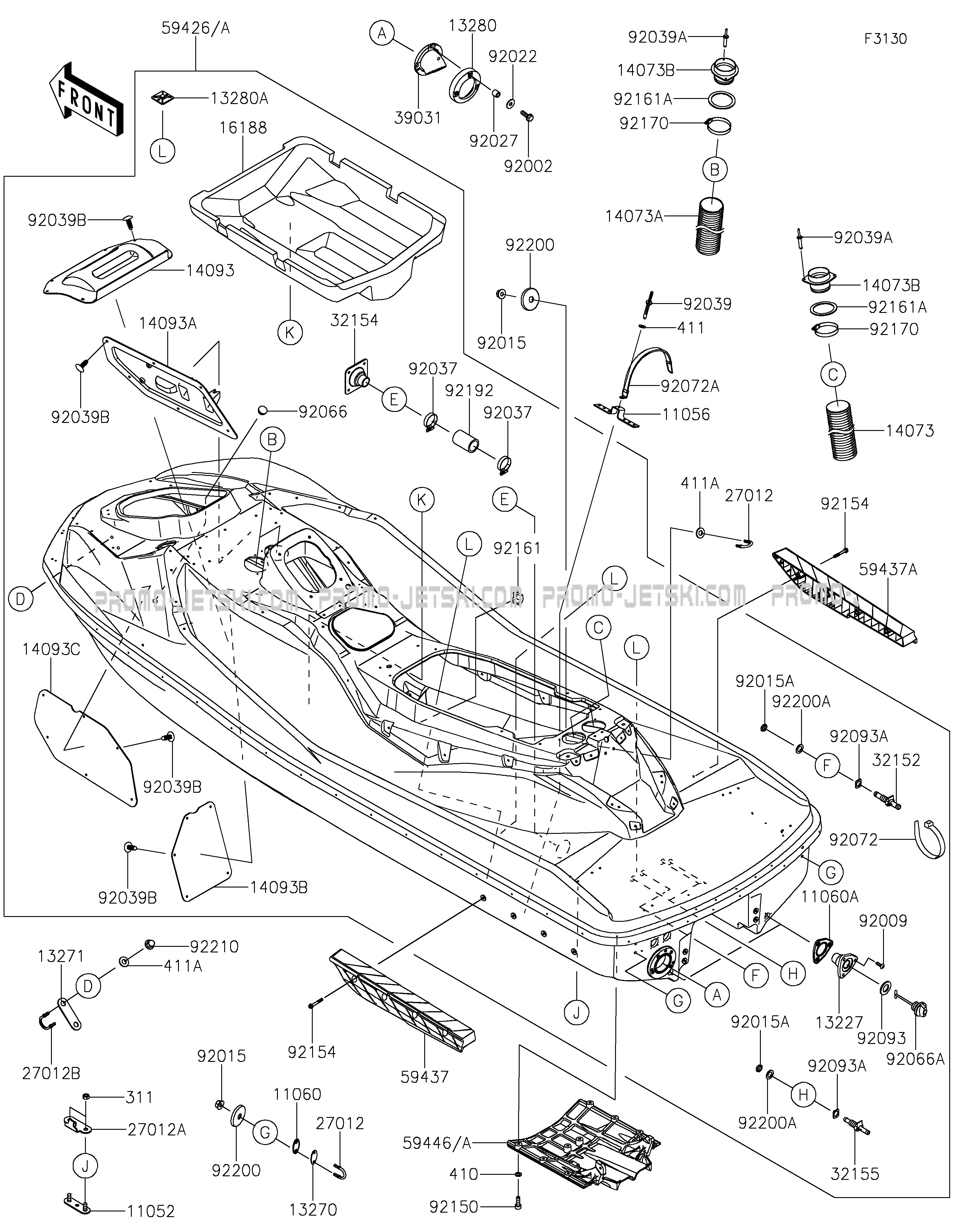 Below, find all references of original and spare parts for Hull for your Kawasaki JET SKI® ULTRA® 310X 2025 and available at Promo-jetski.com.