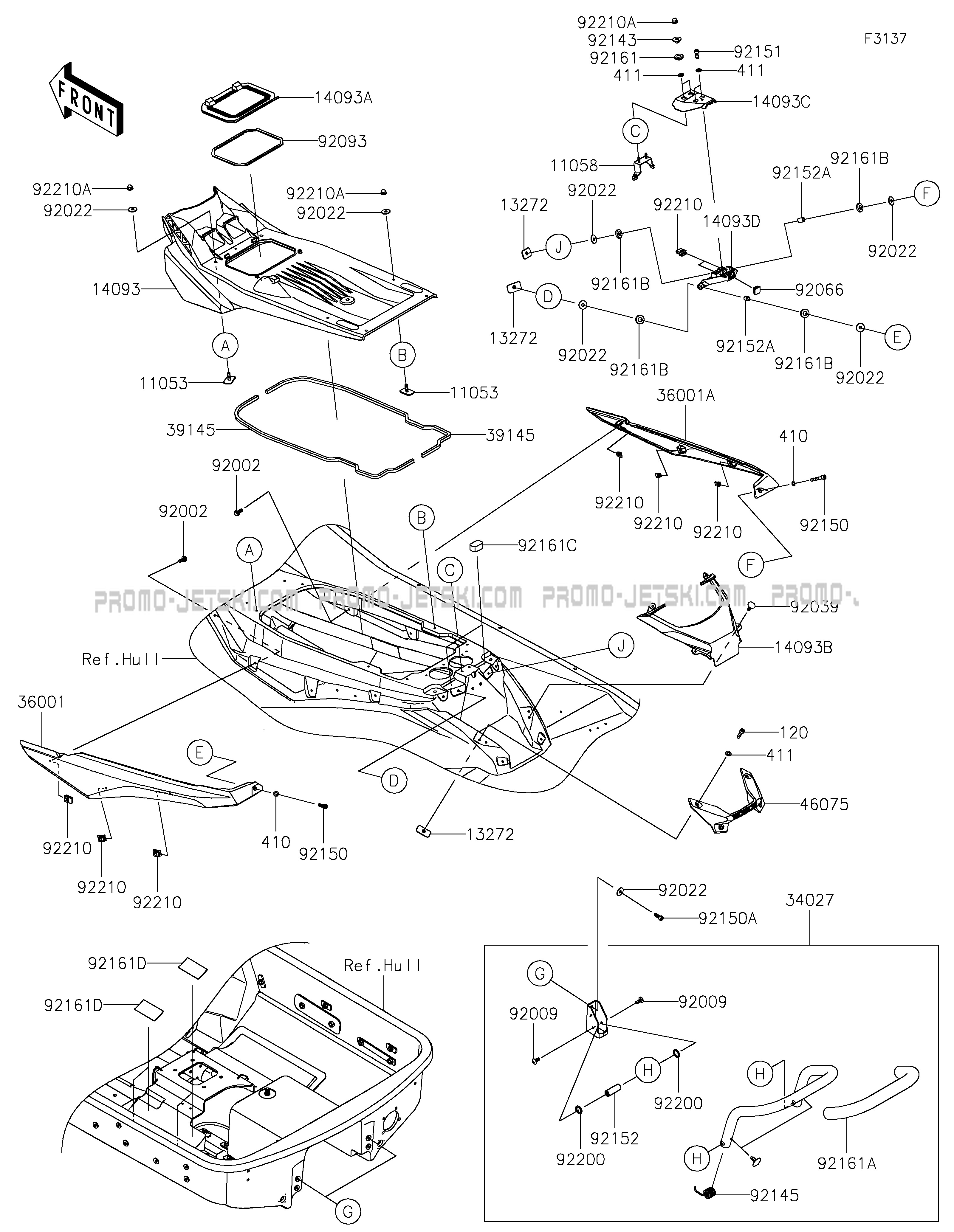 Below, find all references of original and spare parts for Hull Rear Fittings for your Kawasaki JET SKI® ULTRA® 160LX-S ANGLER 2025 and available at Promo-jetski.com.