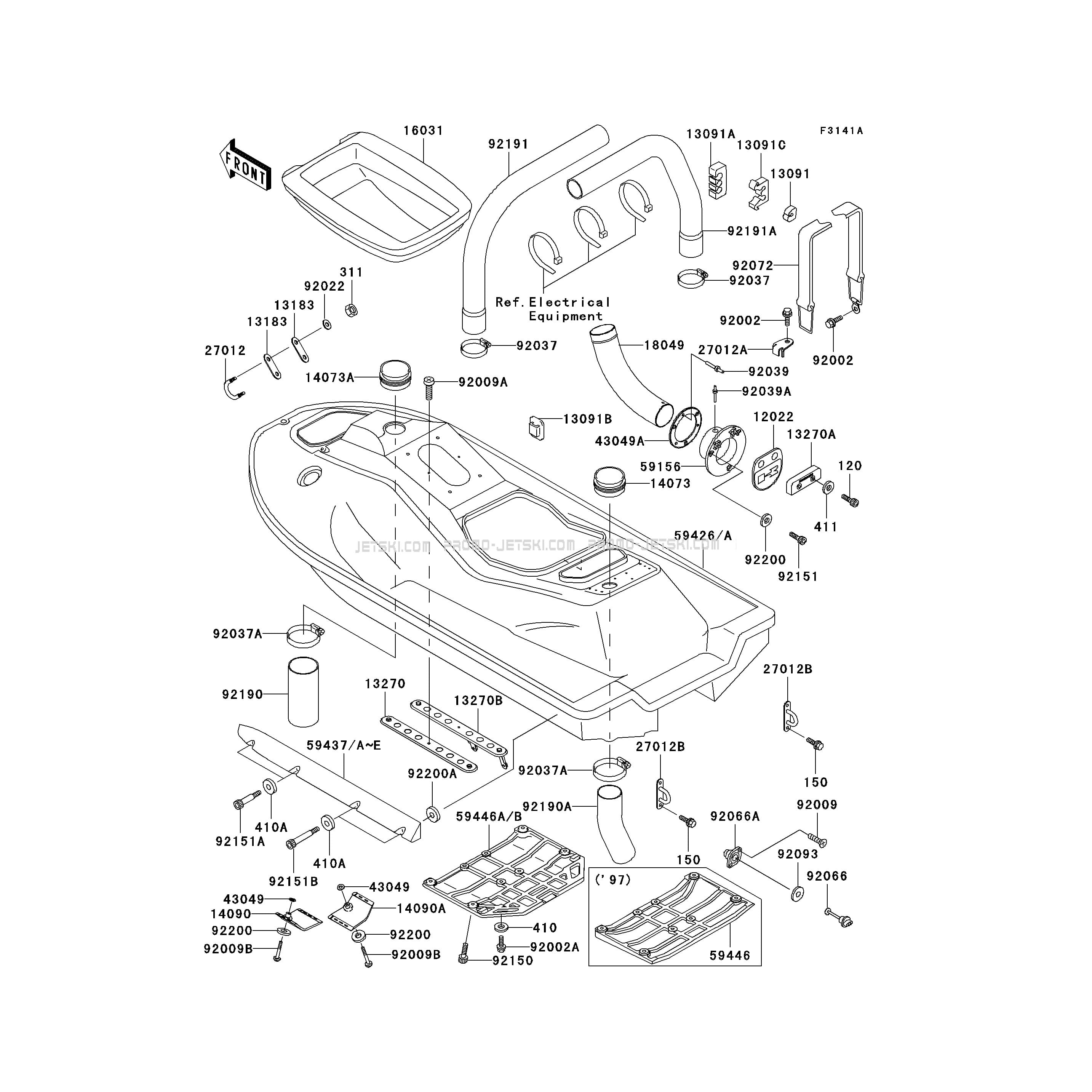 Below, find all references of original and spare parts for Hull(JH1100-A2-A5) for your Kawasaki 1100 ZXi 1997 and available at Promo-jetski.com.