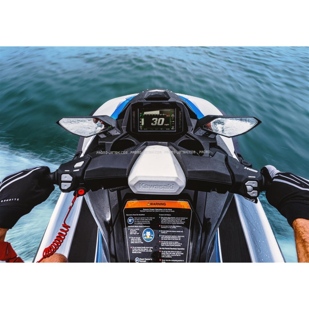 Le système Kawasaki Smart Reverse with Deceleration (KSRD) active électriquement la marche arrière. Commandé par un interrupteur au pouce sur la poignée droite, il permet de contrôler la poussée d’une main et aide à ralentir le Jet Ski.
