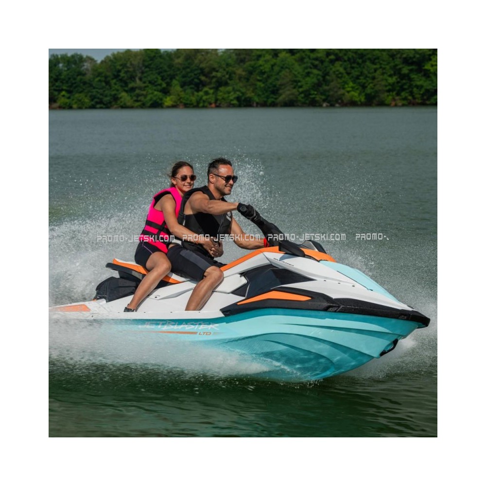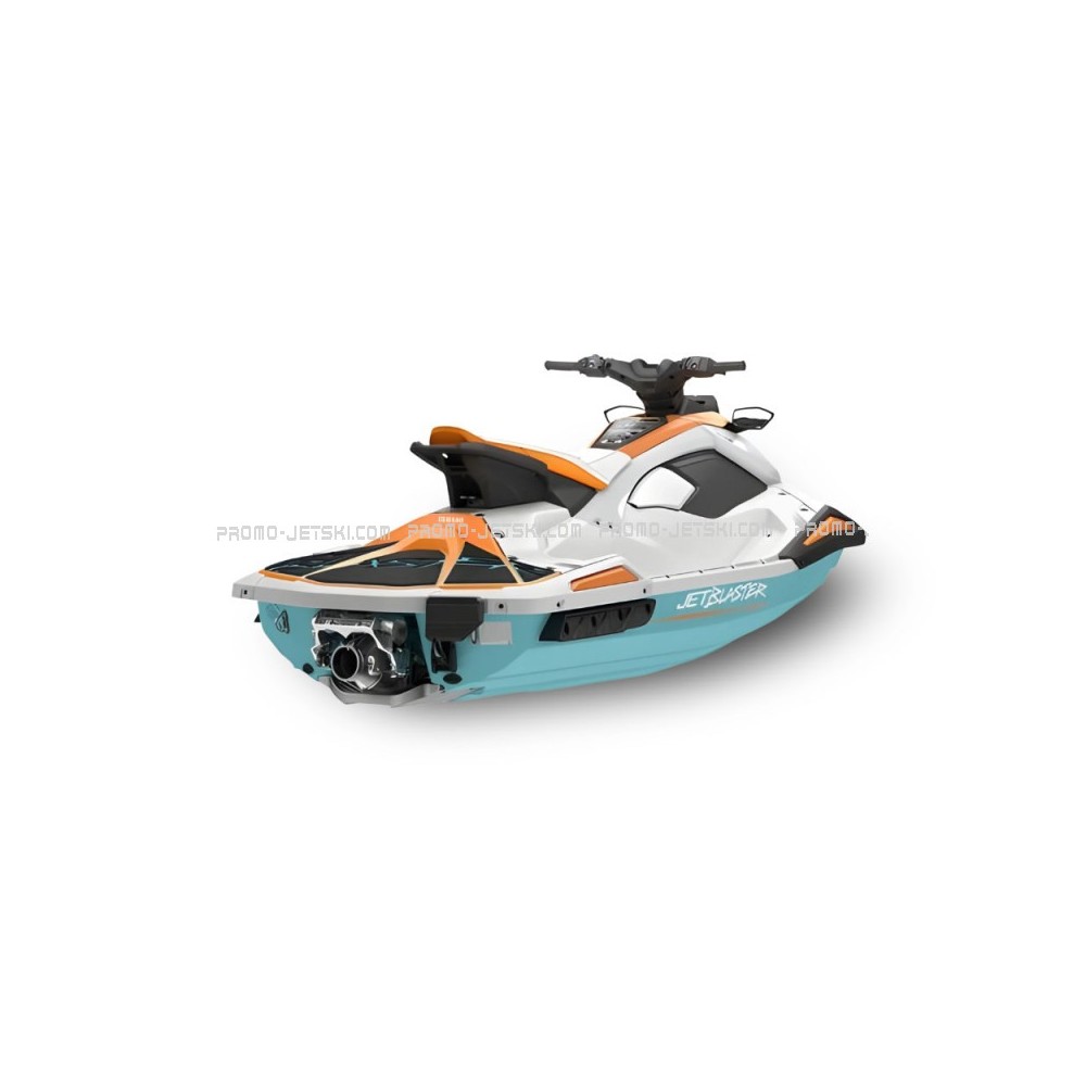 Le JetBlaster LTD 2026 séduit par son design sportif et audacieux. Sa coque bicolore turquoise et blanche, rehaussée de touches orange, souligne des lignes fluides et agressives. Ce style marquant allie esthétique et fonctionnalité, garantissant autant de plaisir à regarder qu’à piloter.