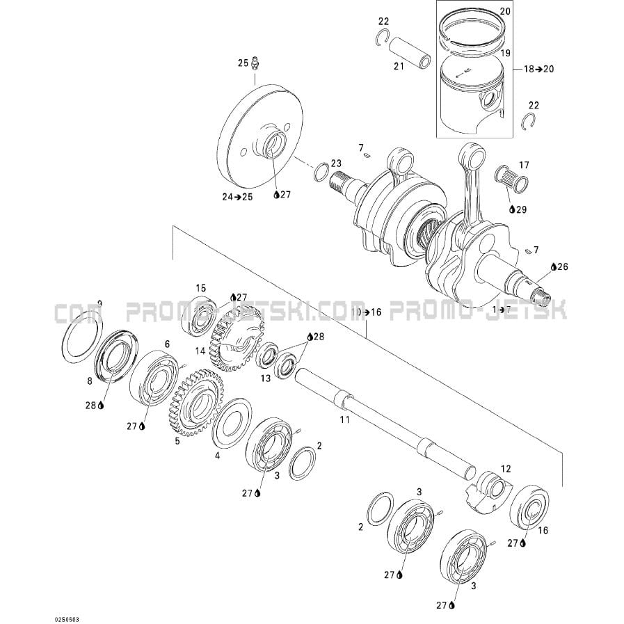 Voici le schéma présentant le 01- Crankshaft, Pistons And Balance Shaft pour un Sea-Doo GTI LE RFI, 2005.
